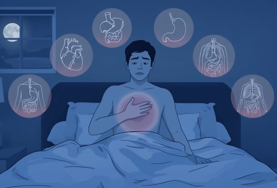 - Γαστροοισοφαγική παλινδρόμηση – το γαστρικό οξύ μπορεί να επιστρέφει στον οισοφάγο, προκαλώντας καύσο, πίεση ή πόνο στο στήθος, φαινόμενο που επιτείνεται λόγω της οριζόντιας στάσης κατά τον ύπνο.